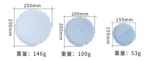 This product consists of three individual round silicone molds, each featuring a decorative scalloped or wavy edge. They come in three different sizes, allowing for the creation of nesting pieces or a variety of items of different dimensions. These molds are commonly used for casting materials like epoxy resin, and their design makes them suitable for creating elegant and artistic finished products. Each mold also has a small central point, possibly indicating a place for a hole or a decorative element.